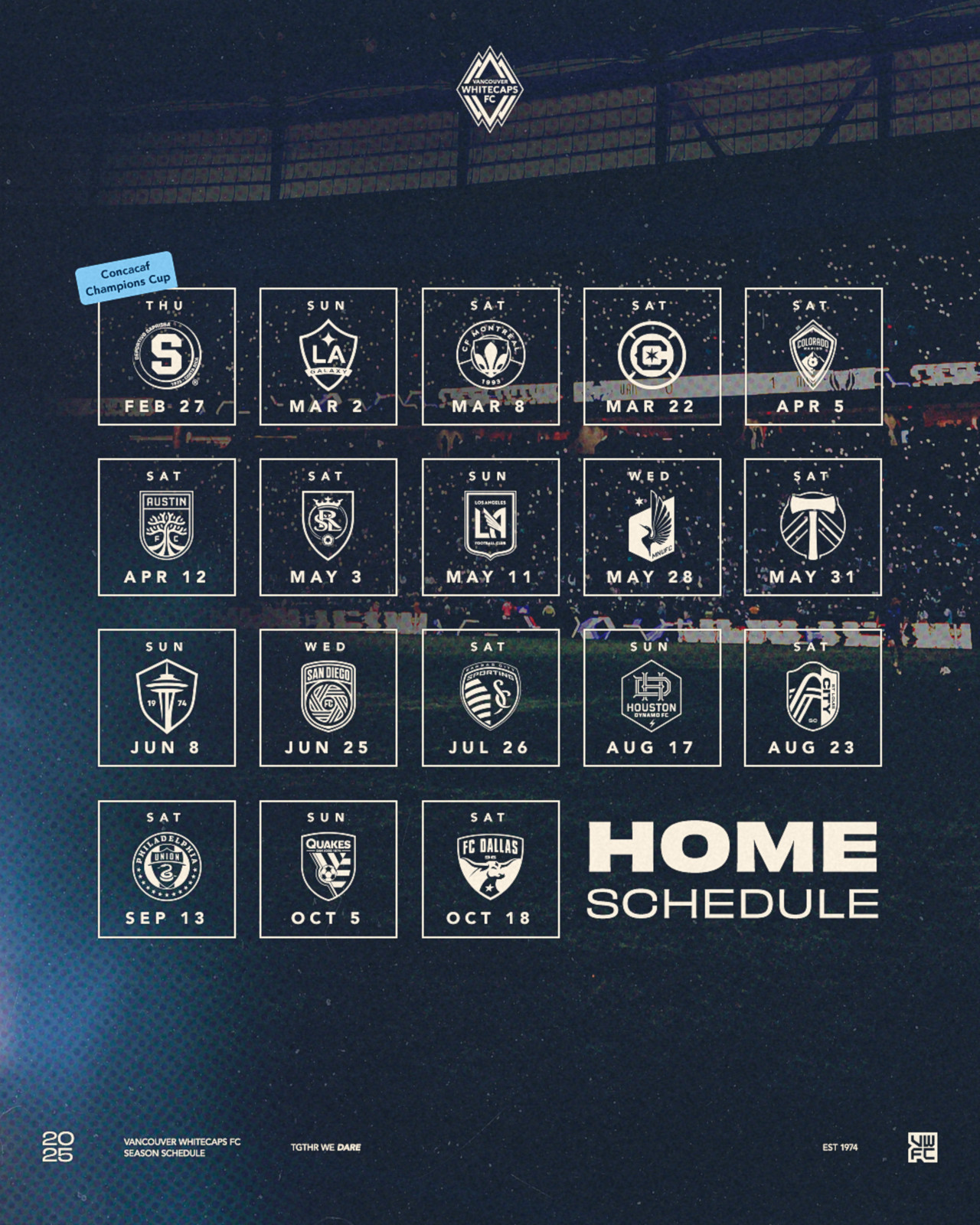 The start of the 2025 MLS season will come in-between Whitecaps FC beginning play in the Concacaf Champions Cup, starting with a Round One matchup against Costa Rican side Deportivo Saprissa. The first leg will take place in Costa Rica on Thursday, February 20, while the second leg will be hosted at BC Place on Thursday, February 27.